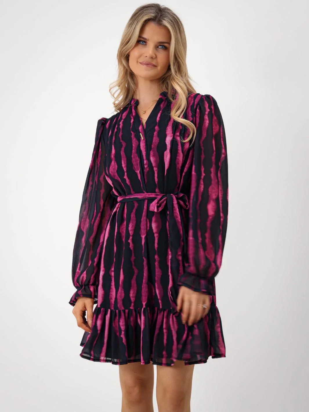 Bold, flirty, and effortlessly chic — the Venus Mini Dress is made to make an entrance. Featuring a striking print in magenta and black tones, this dress is the ultimate statement for nights out, dinners, or special events. The soft, lightweight fabric flows beautifully with every step, while the tie-waist belt flatters your silhouette. A subtle frill hem and long semi-sheer sleeves add the finishing touches of femininity.